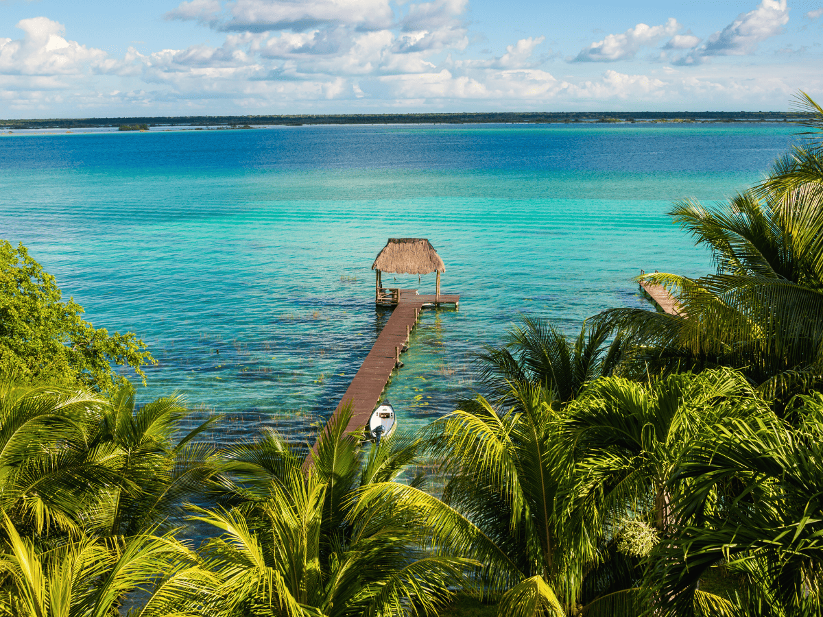Más adelante, Bacalar se despliega en tonos que parecen irreales. La laguna refleja distintos matices de azul según la luz del día, y basta un instante para entender por qué es uno de los lugares más especiales del sur de Quintana Roo.